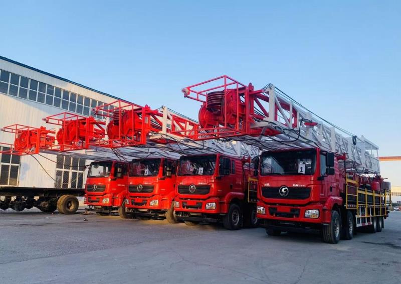 XJ450型修井机主要用于中浅井大修、修井、试油、投捞、检泵作业,其底盘采用汽车底盘或特种作业车底盘,主要工作系统为提升作业系统和旋转作业系统。最大静钩载为1125kN,配备钻台和相关附件可进行大修和侧钻作业。
