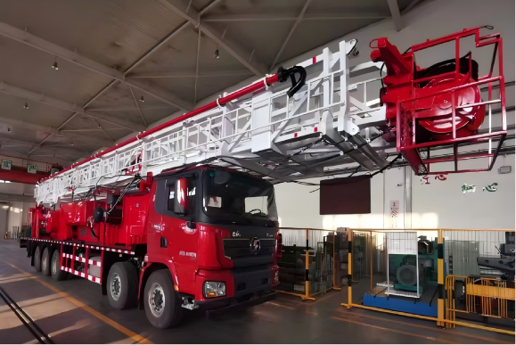 XJ650型修井机主要用于中浅井大修作业,其主要工作系统为提升作业系统和旋转作业系统。最大静钩载为1580KN,配备钻台和相关附件可进行大修和侧钻作业。主要技术特点:(1)井架采用35m双节液压起升、伸缩井架;(2)12×8底盘,越野性能好;(3)绞车辅助刹车为水刹车,可选气压钳式刹车或气控水冷盘式刹车;(4)可选配钻台、简易工作台;(5)采用五正五倒防反转的转盘传动装置。